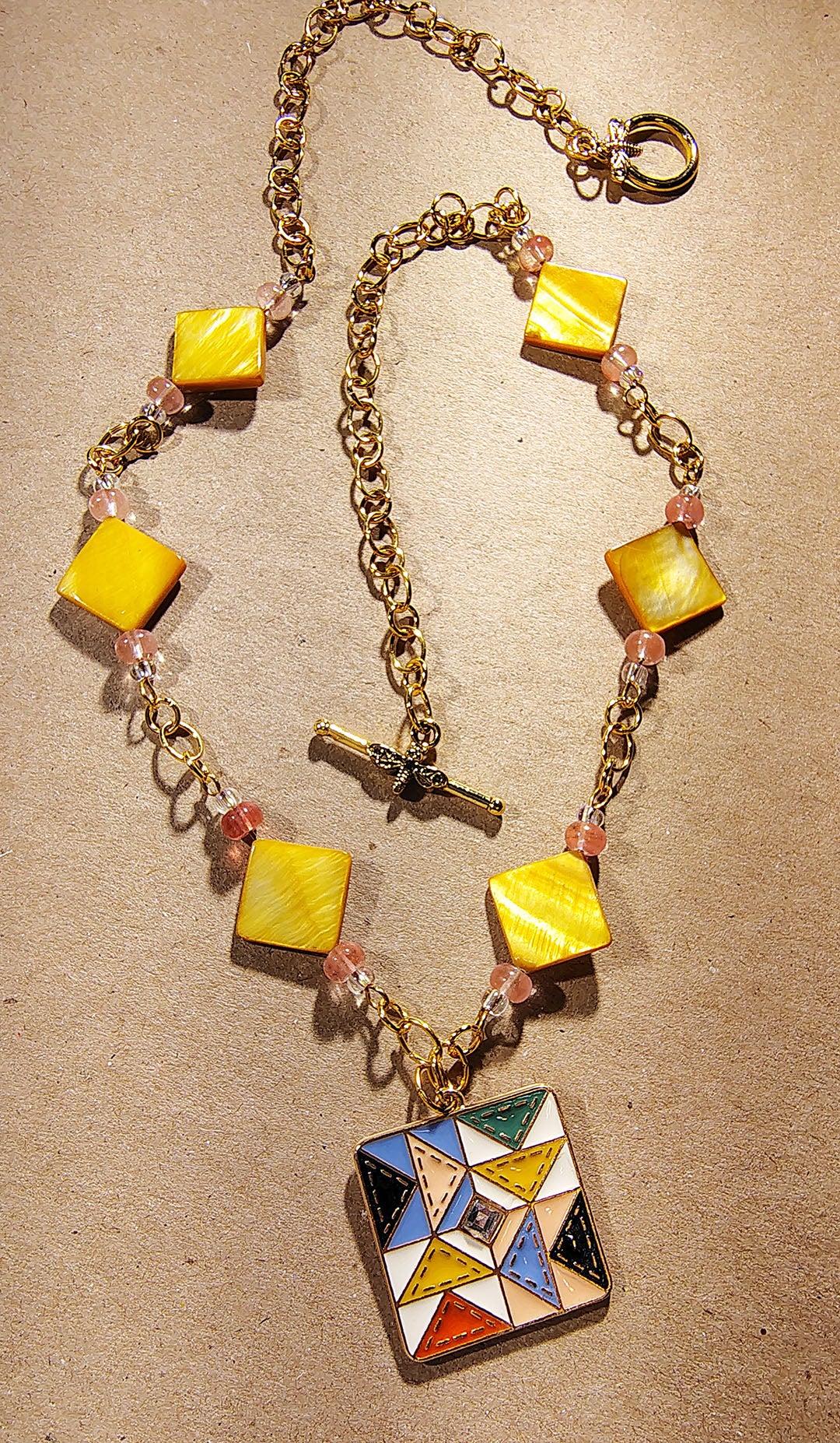I adapted this key ring to serve as a pendant for a "Quilting Bee" necklace. The necklace is accented with gold mother of pearl square beads, peach colored round glass beads, and clear AB finish beads, matching the colors in the pendant. The pendant is 1" square and the necklace is 24" long. The gold plated toggle is accented with a bee. Quilters will love this necklace!