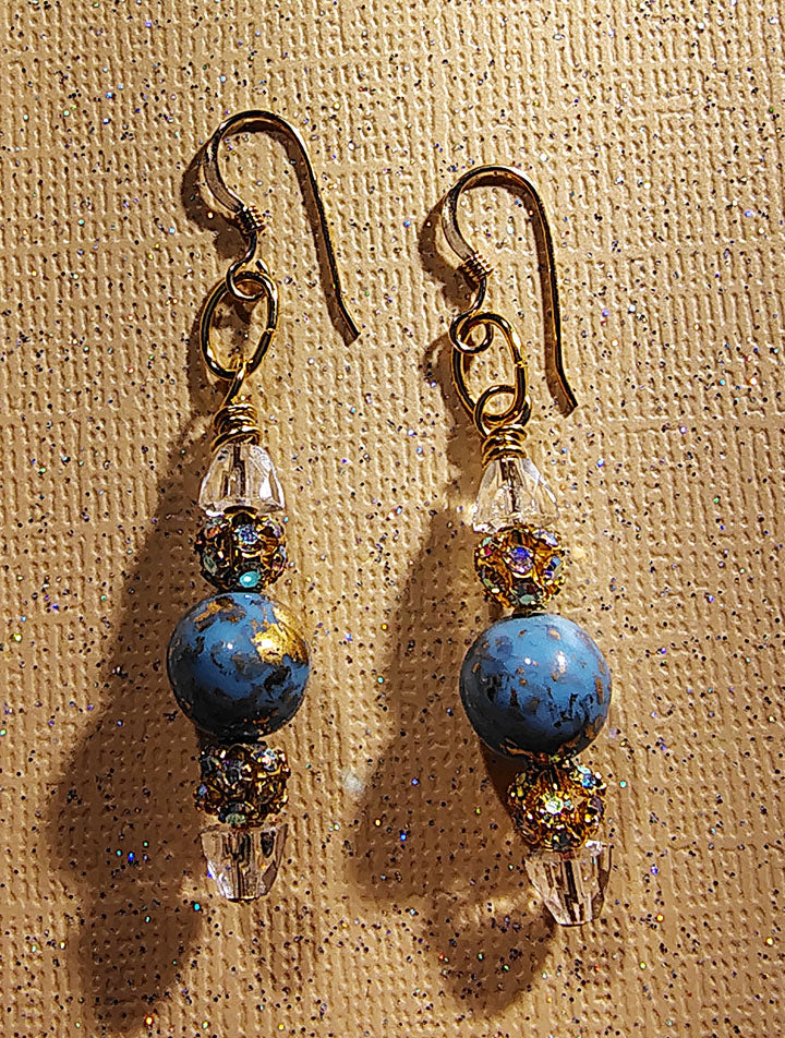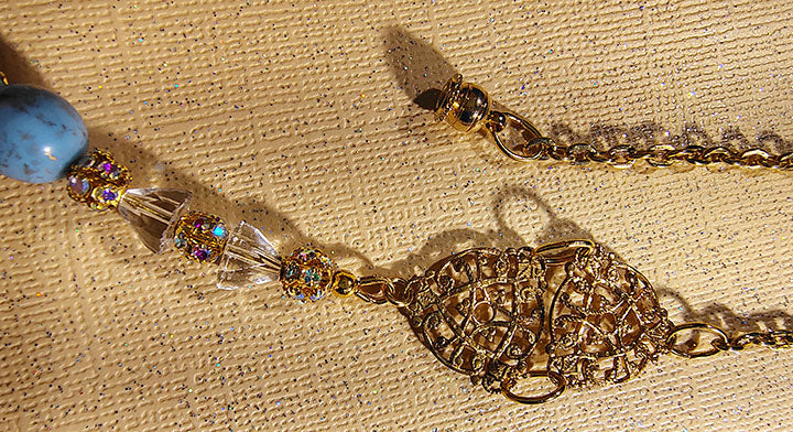 Blue Dolomite with Gold beads, upcycled from an old necklace, brass stampings, a found chain and rhinestone beads add bling to a once drab design. Necklace measures 24" and is paired with earrings with a drop of 2". Enjoy the "redo"!
