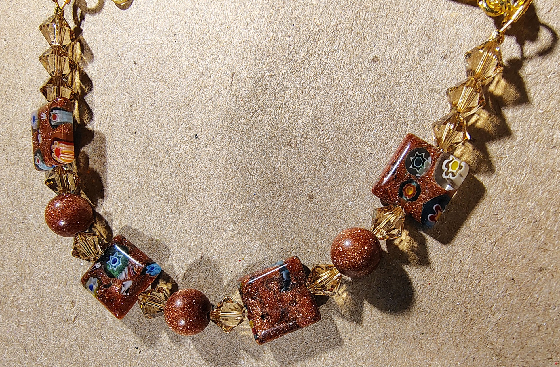 Square 12 mm sparkly millefiori beads, round goldstone beads and golden crystal glass beads are a lovely combination for this 6 1/2 " bracelet. Enjoy the compliments you will receive.